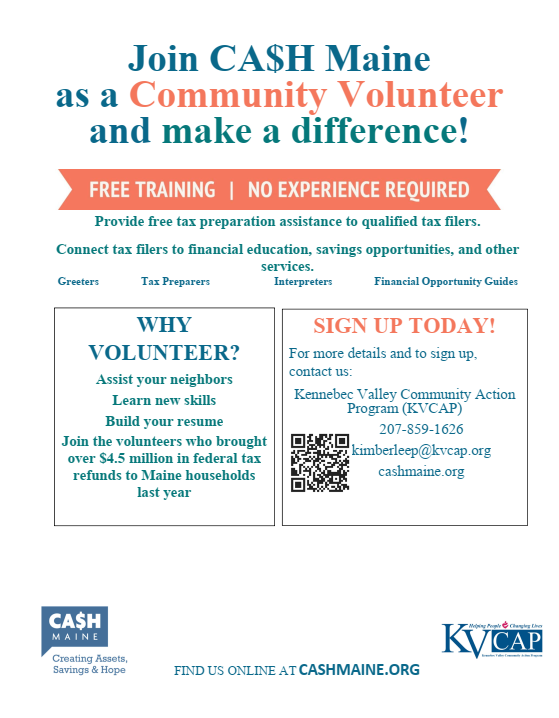 Calling all volunteers! Looking for an interesting volunteer opportunity? Look no further…Join CA$H Maine and make a difference! No experience required! For more information, scan the QR code below, or contact Kimberlee Petrey at 859-1626 or kimberleep@kvcap.org.