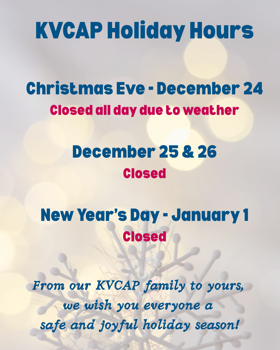 Due to incoming weather, KVCAP’s holiday hours have changed! Please take note.